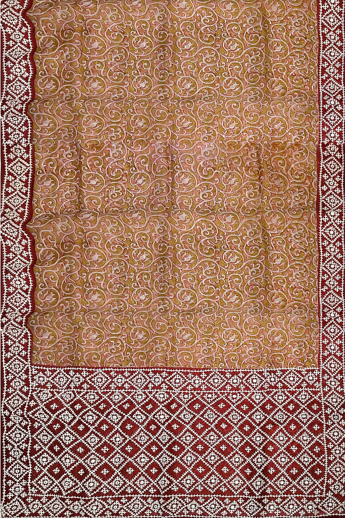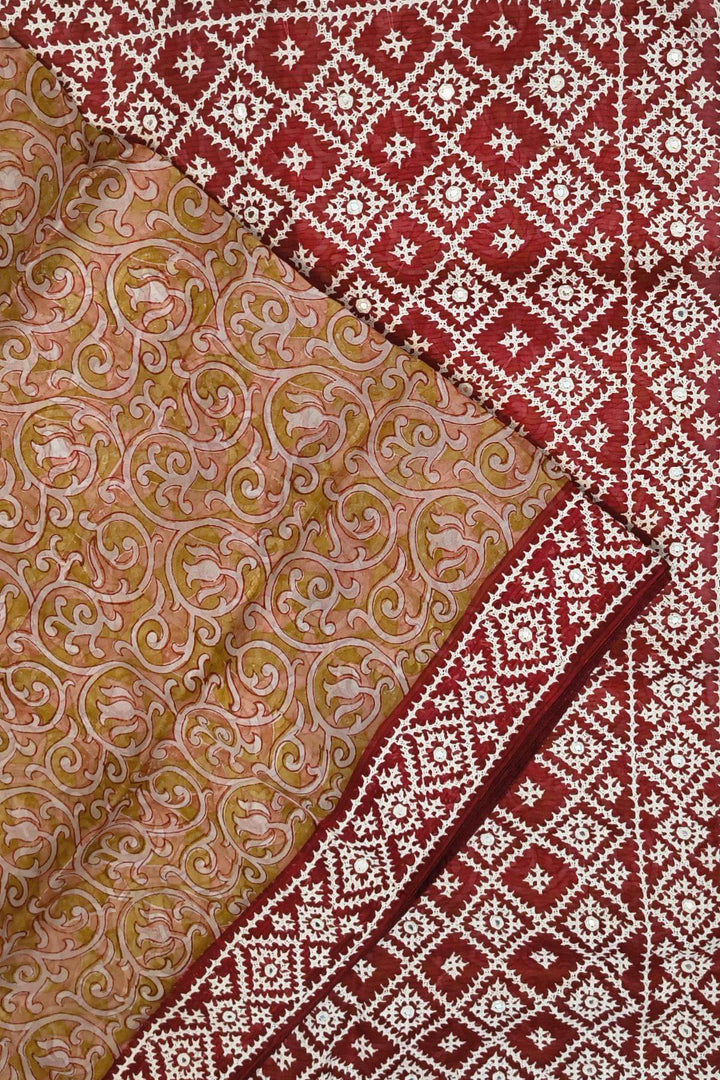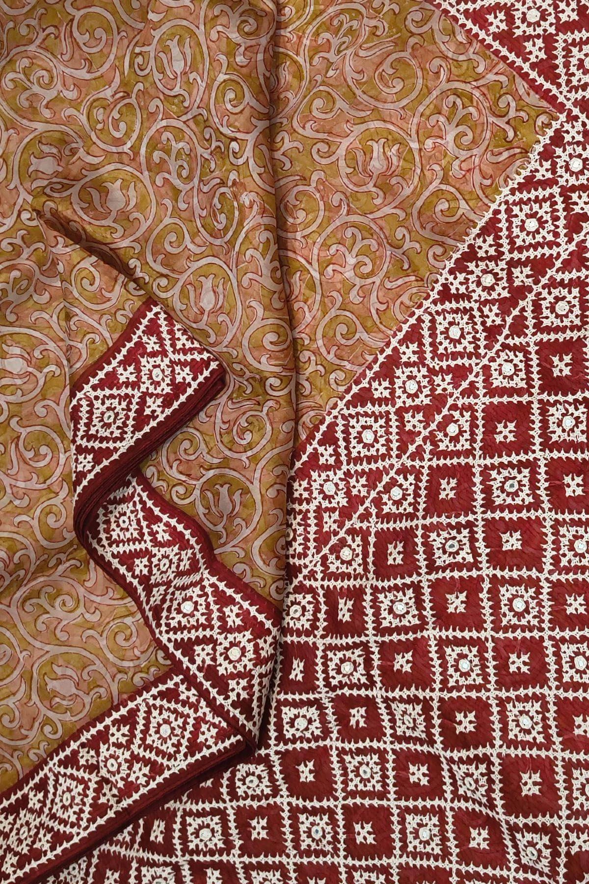 Description : Organza silk saree in mustard & pink with kutch embroidery borders & pallu