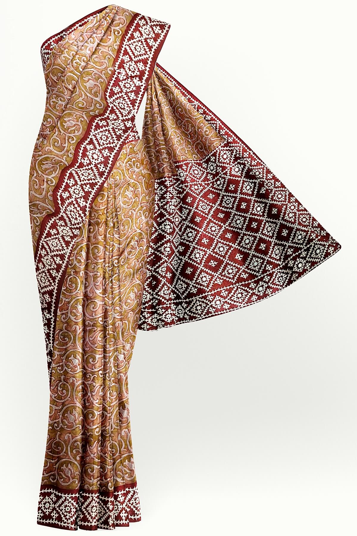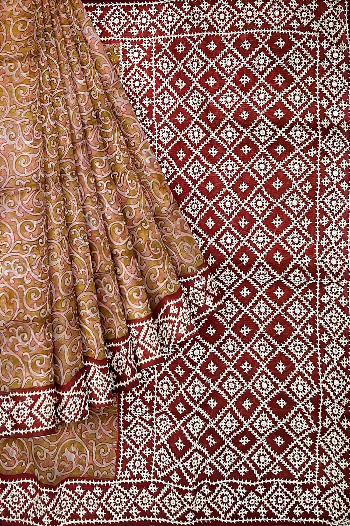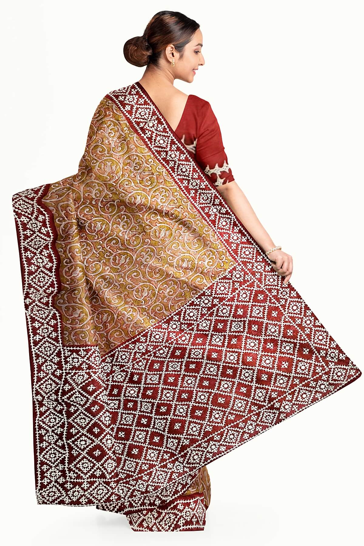 Description : Organza silk saree in mustard & pink with kutch embroidery borders & pallu