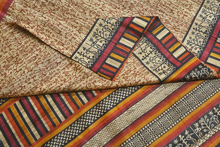 Description : Handloom desi tussar pure silk saree in tribal art pattern with multicoloured striped border