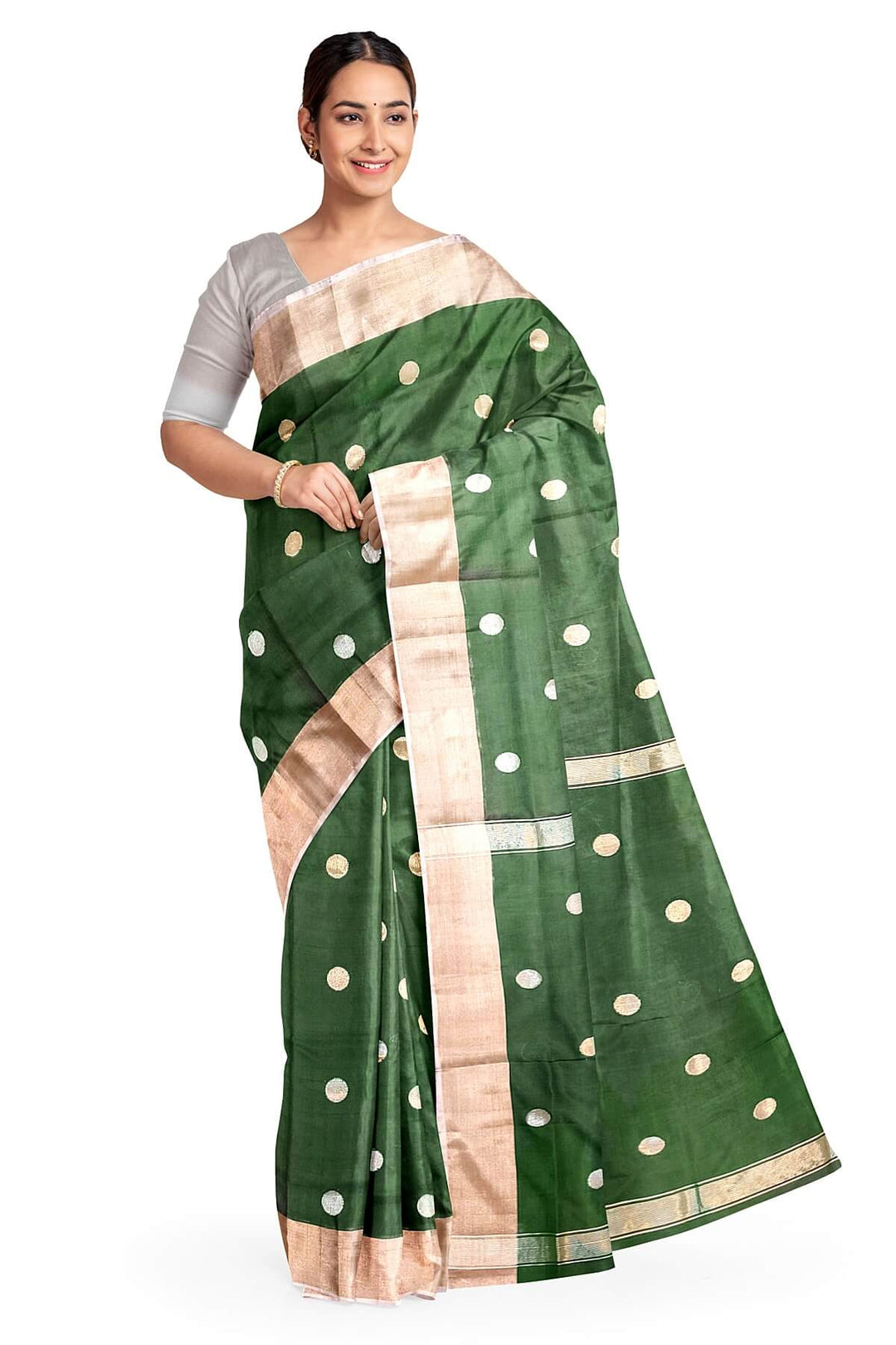 Handwoven Uppada pure silk saree in bottle green with round motifs
