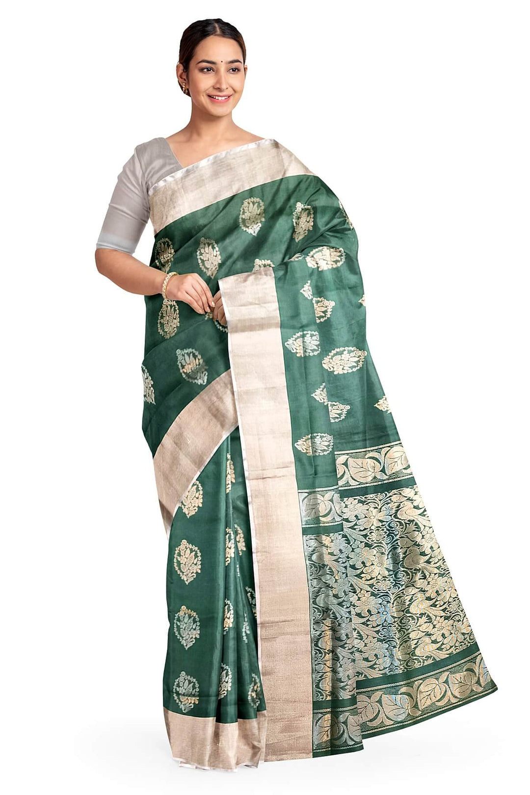 Handwoven Uppada pure silk saree in two tone bottle green with gold & silver motifs