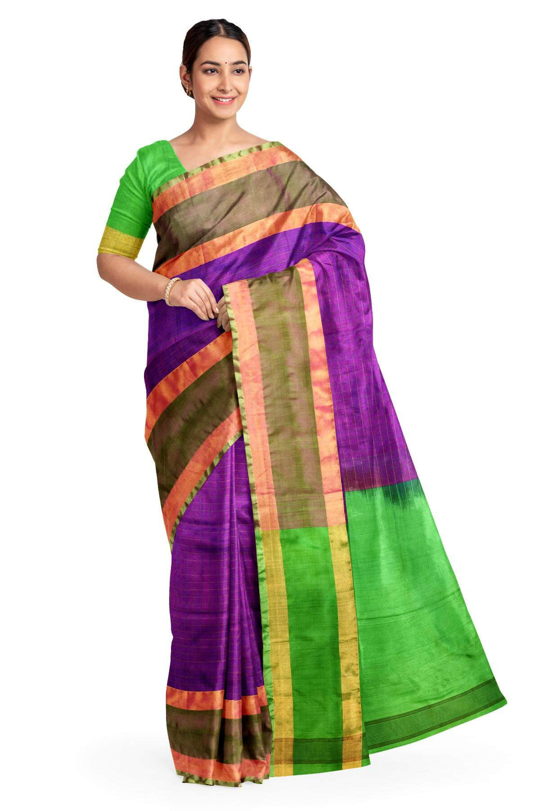 Handloom Uppada pure silk saree in checks in purple and a contrast pallu in green
