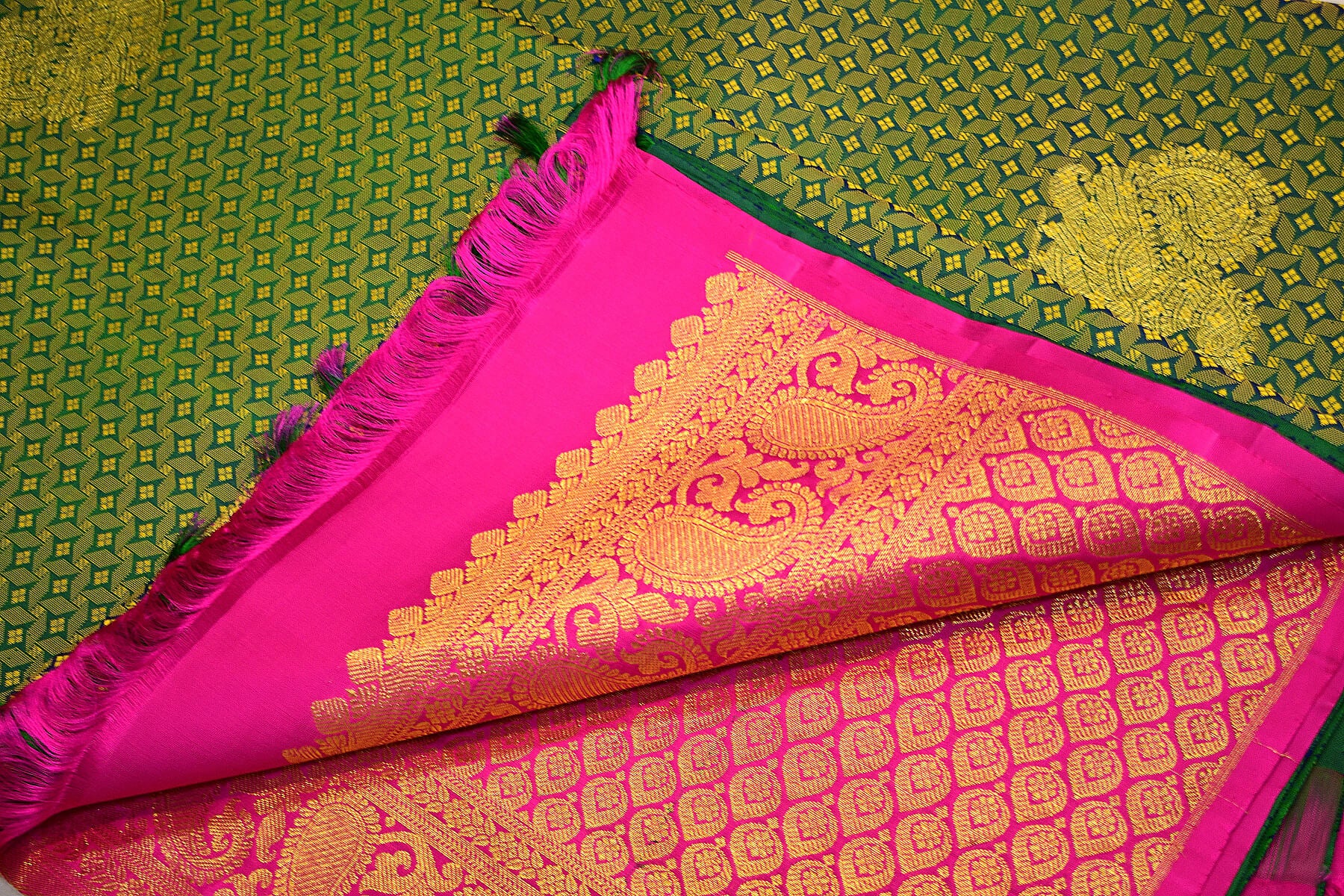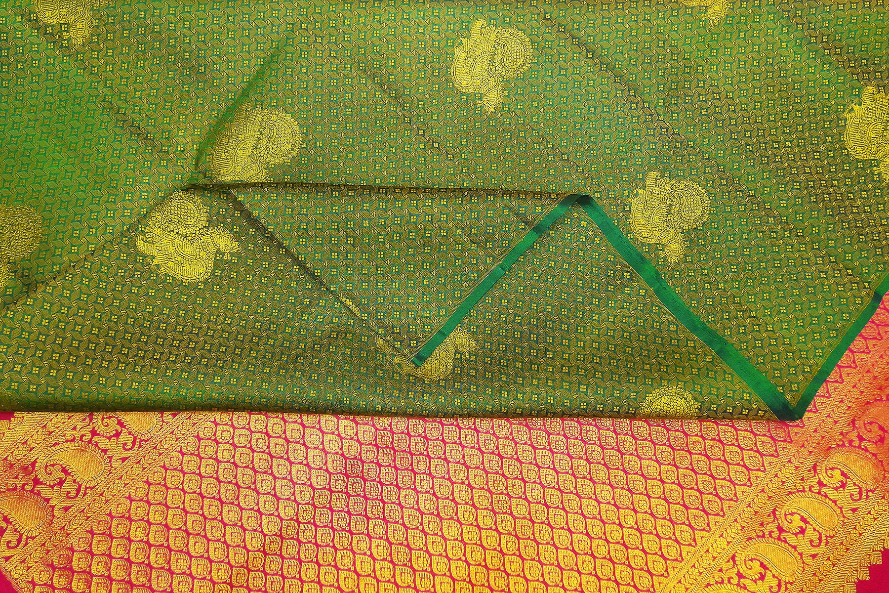 Description : Handwoven Kanchi pure silk saree with peacock motifs. Its in borderless style.