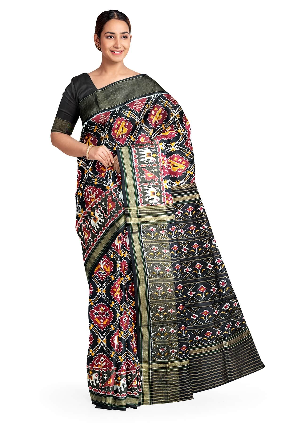 Description: Handwoven Ikkat pure silk saree in black in  in narikunj pattern. The pallu has floral pattern with elephant & bird motifs in border..