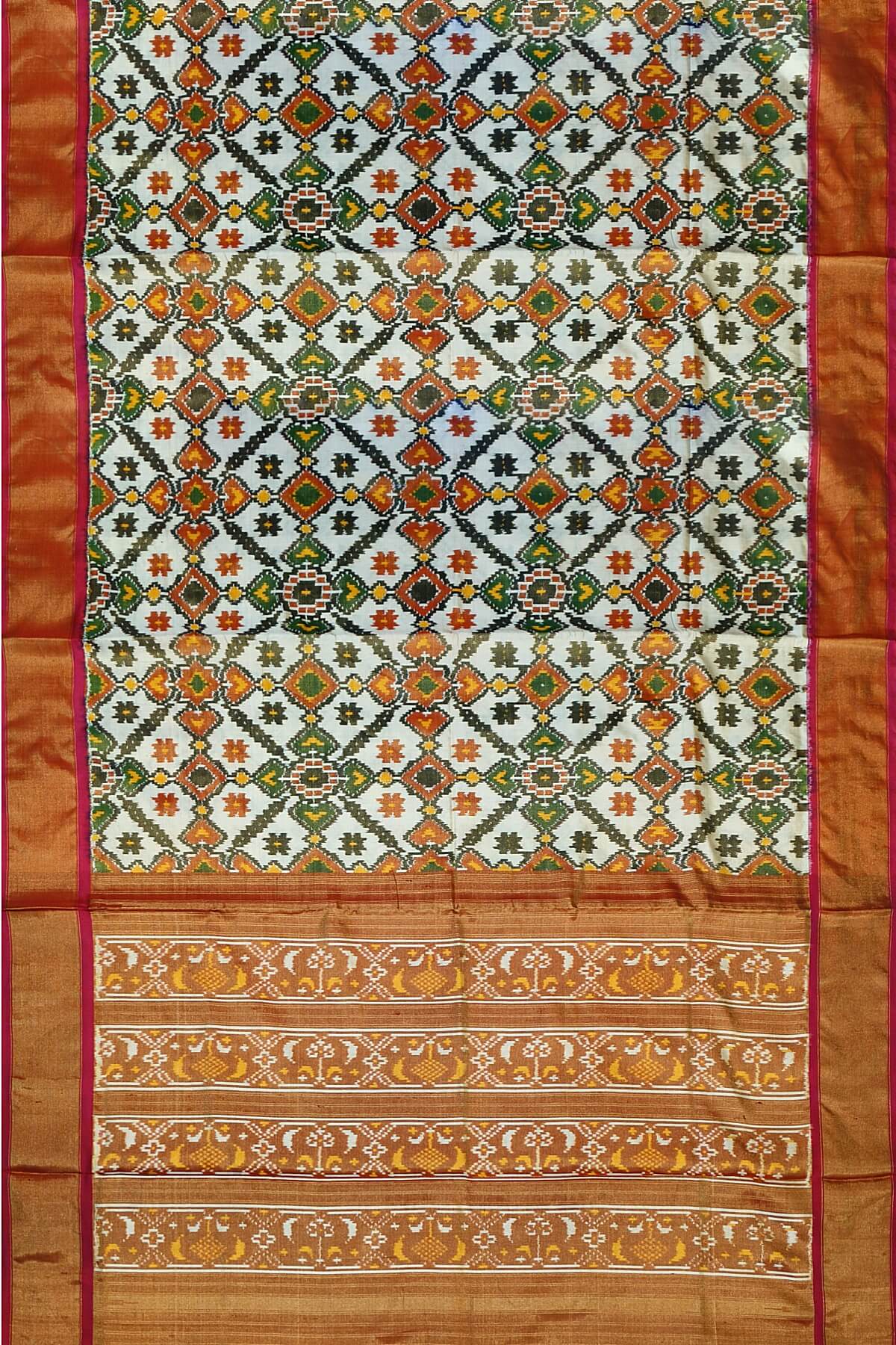 Description: Handwoven ikkat silk tisue saree in off white in pan bhat pattern