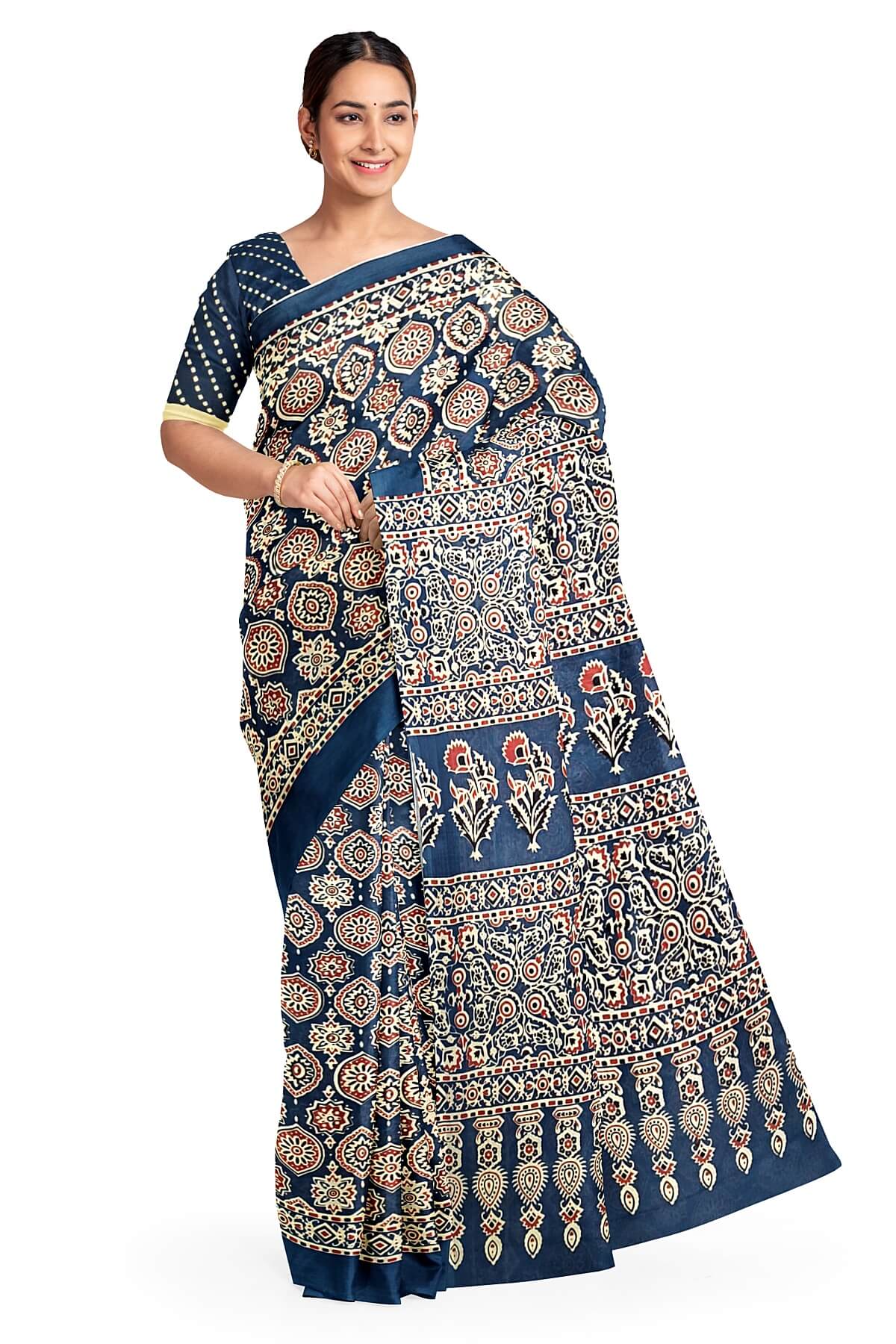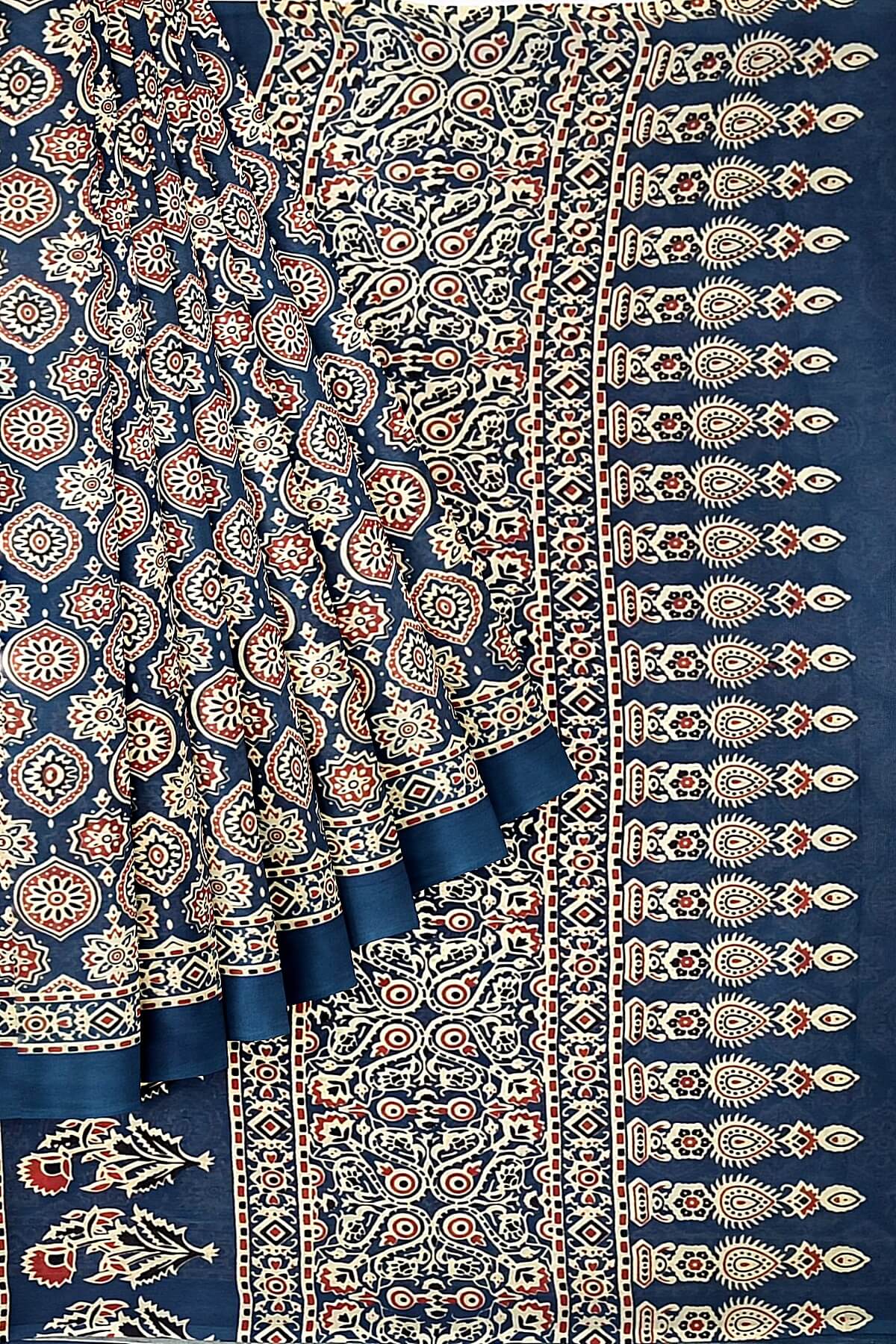 Description : Jaipur mul cotton saree in navy blue & red in Ajrakh print
