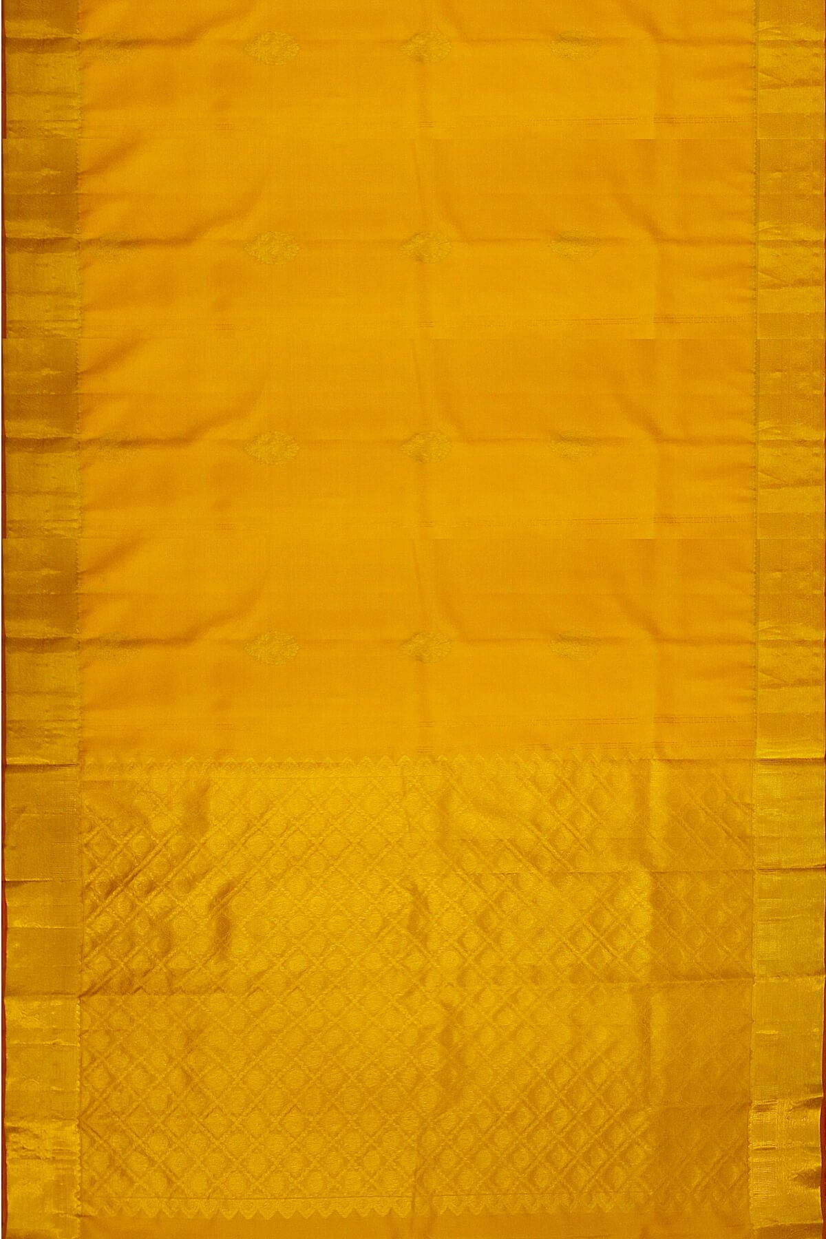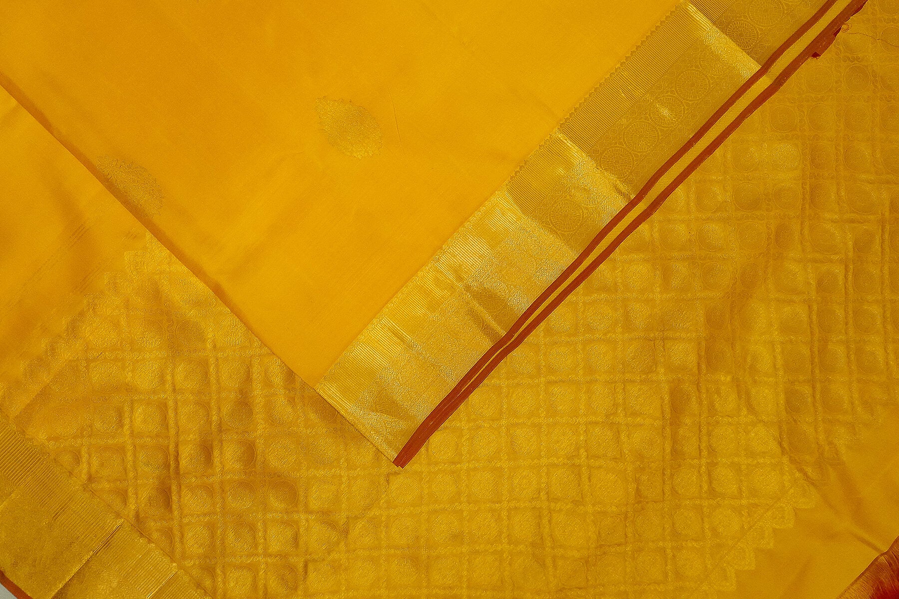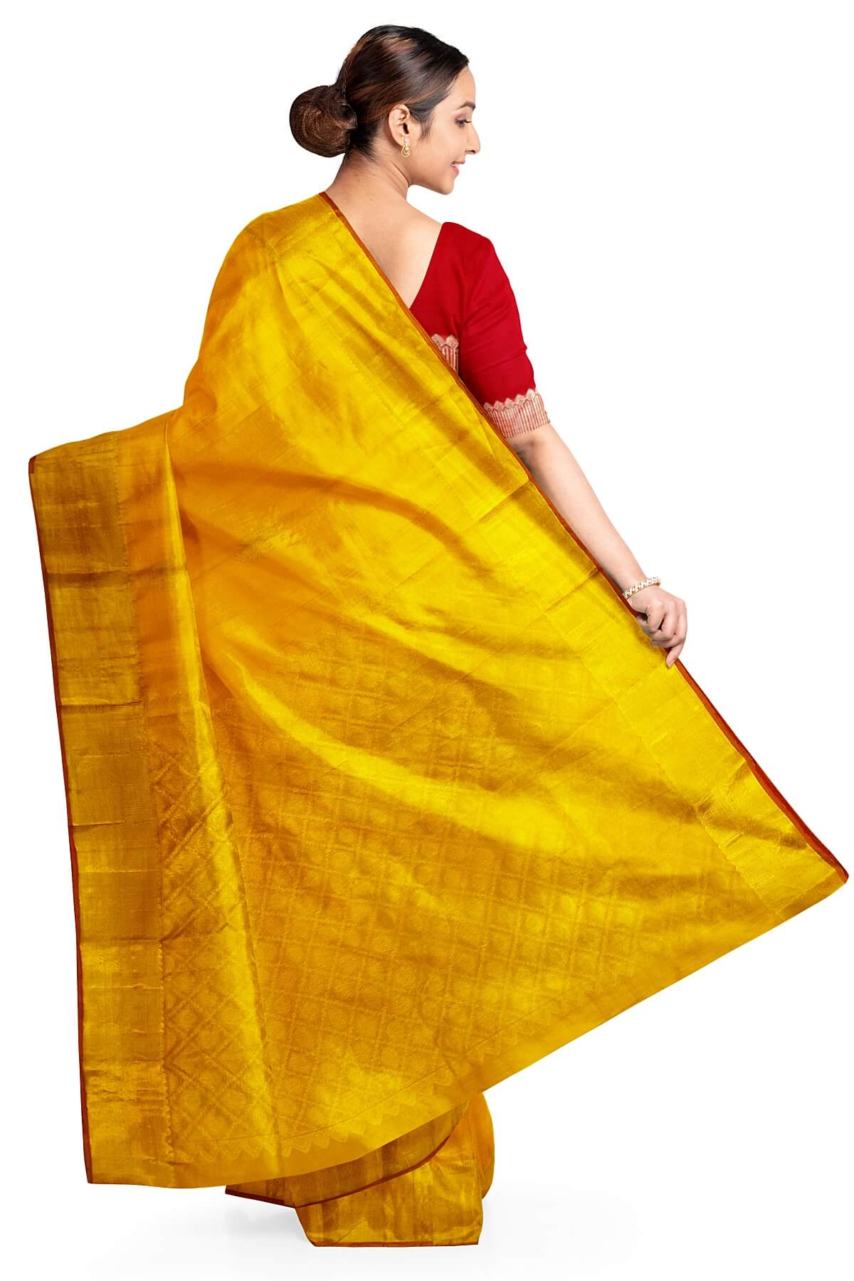 Description: Kanchi pure silk saree in yellow with floral motifs on the body, This is enhanced by rich pallu and motifs in the border