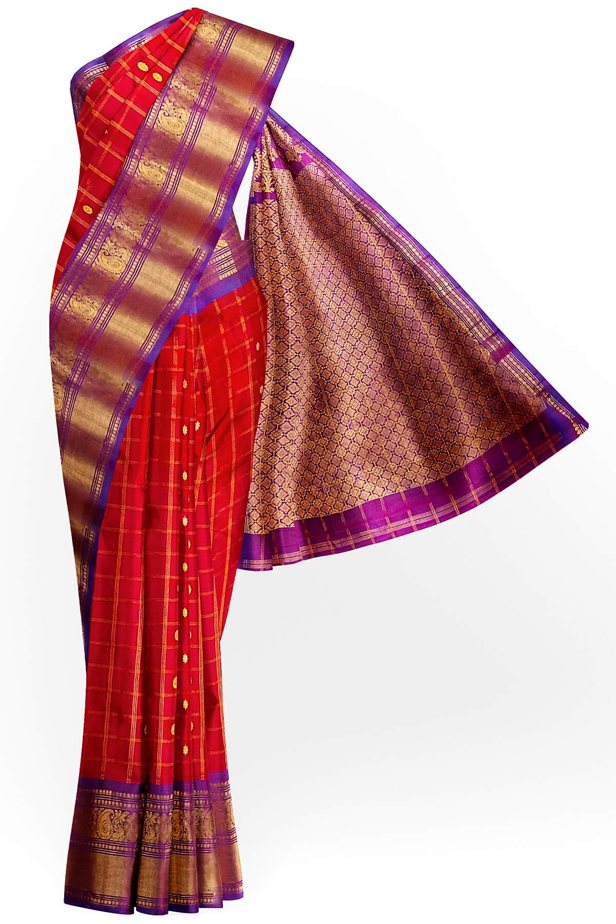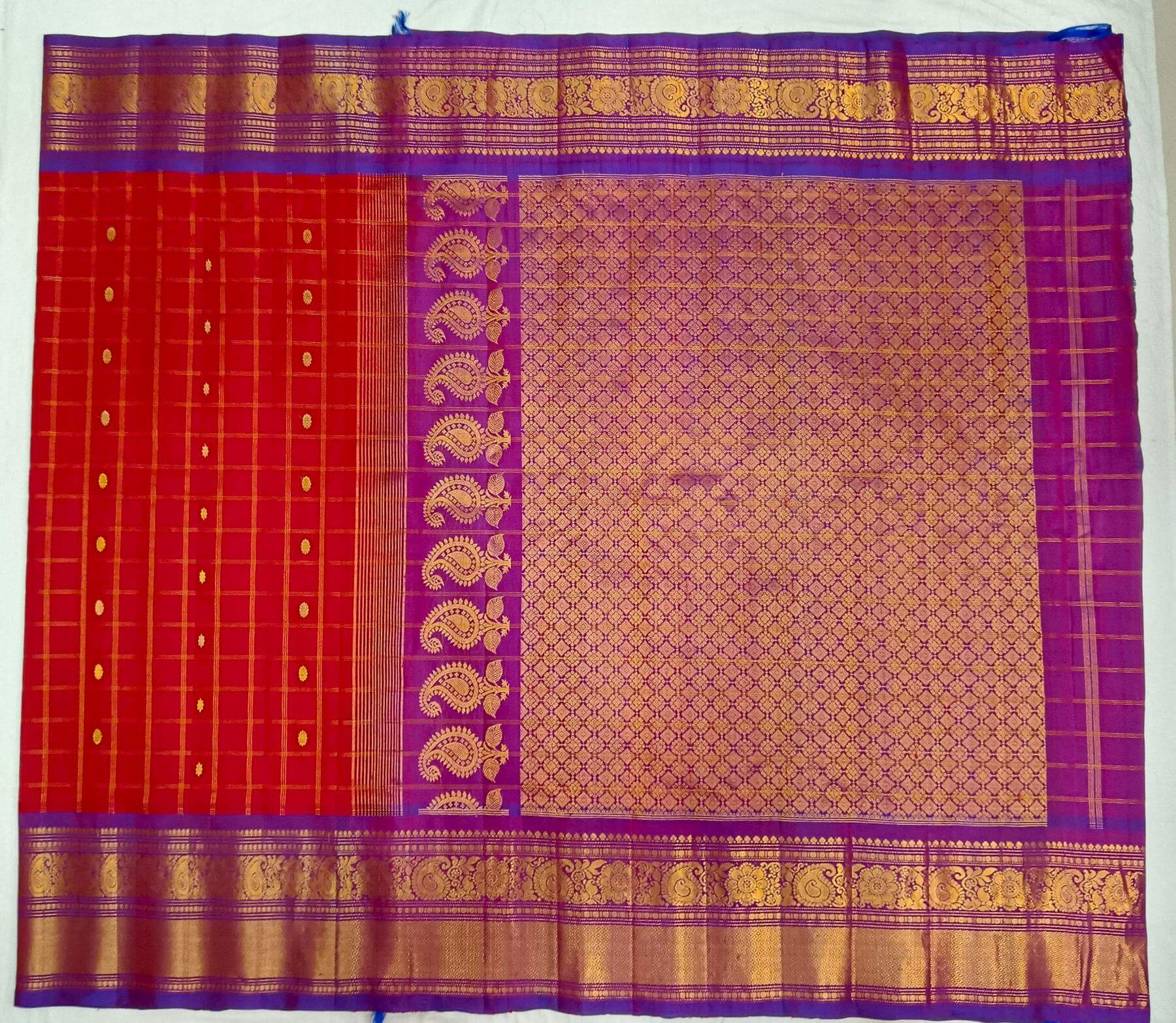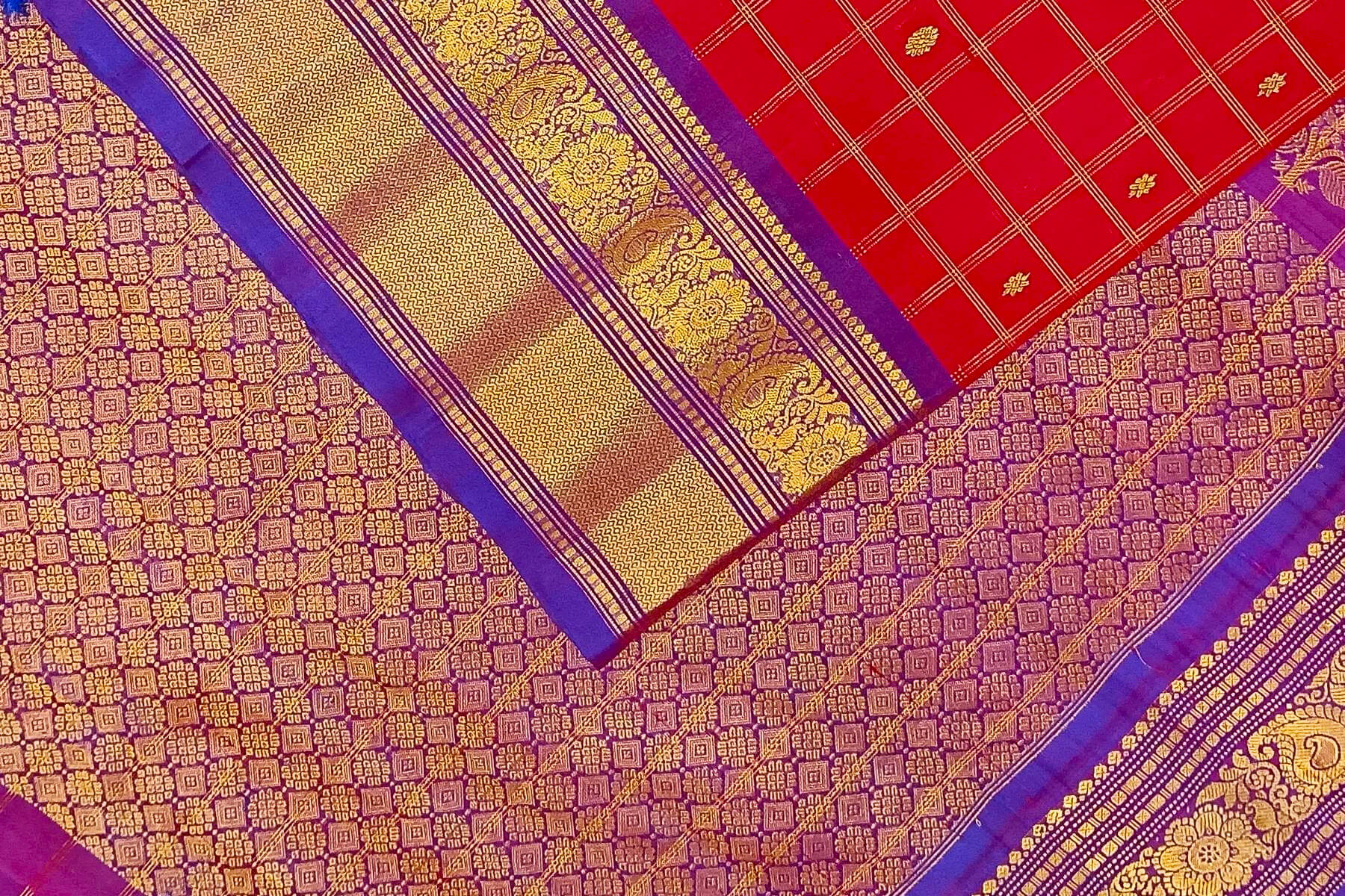 Description : Handloom Gadwal SICO ( silk cotton) saree in red & purple with checks & buttis