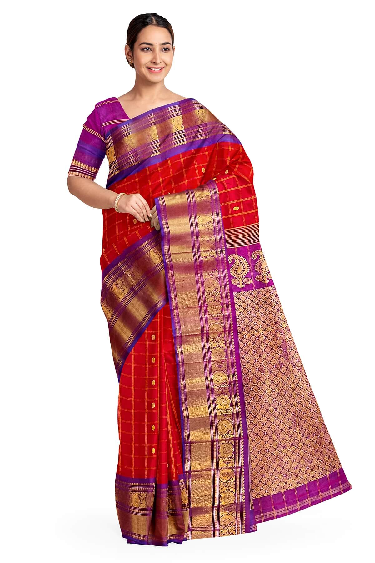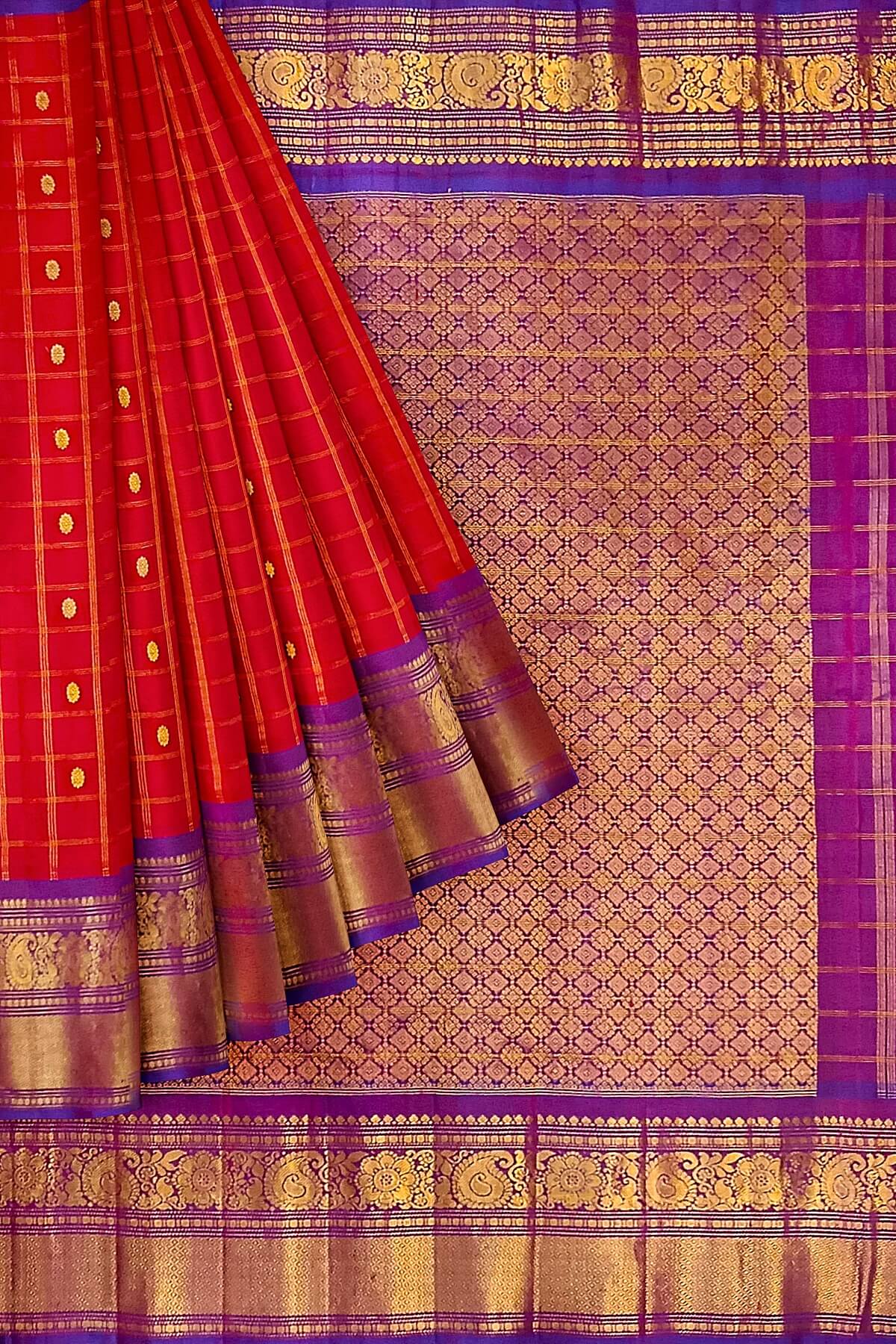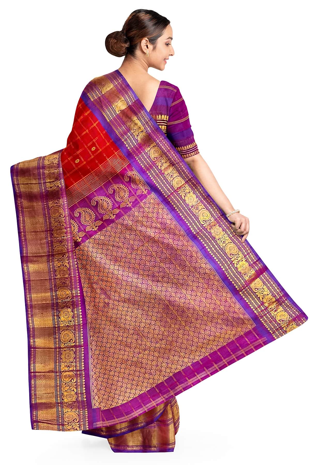 Description : Handloom Gadwal SICO ( silk cotton) saree in red & purple with checks & buttis