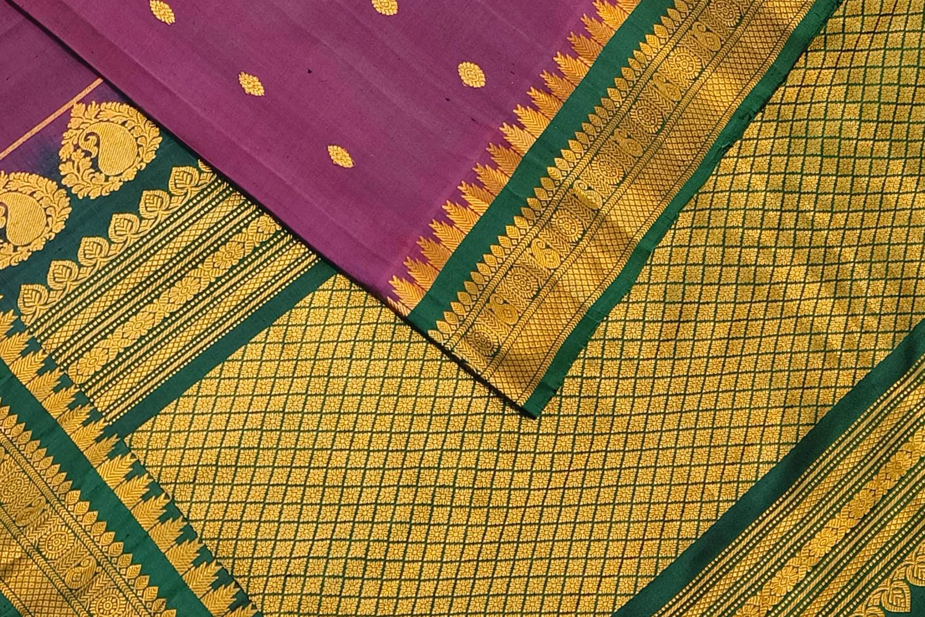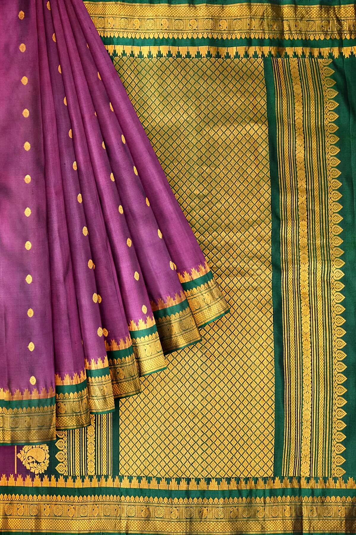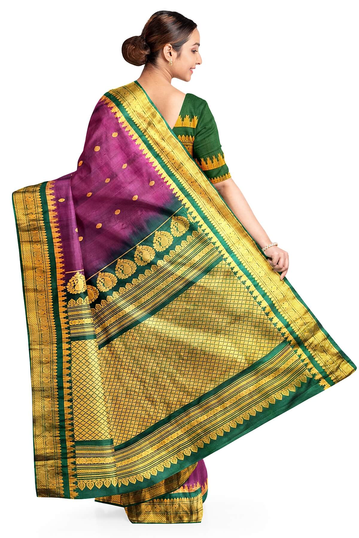 Description : Handwoven Gadwal pure silk saree in wine with small buttis on the body . The contrast pallu & temple border has paisley motifs.