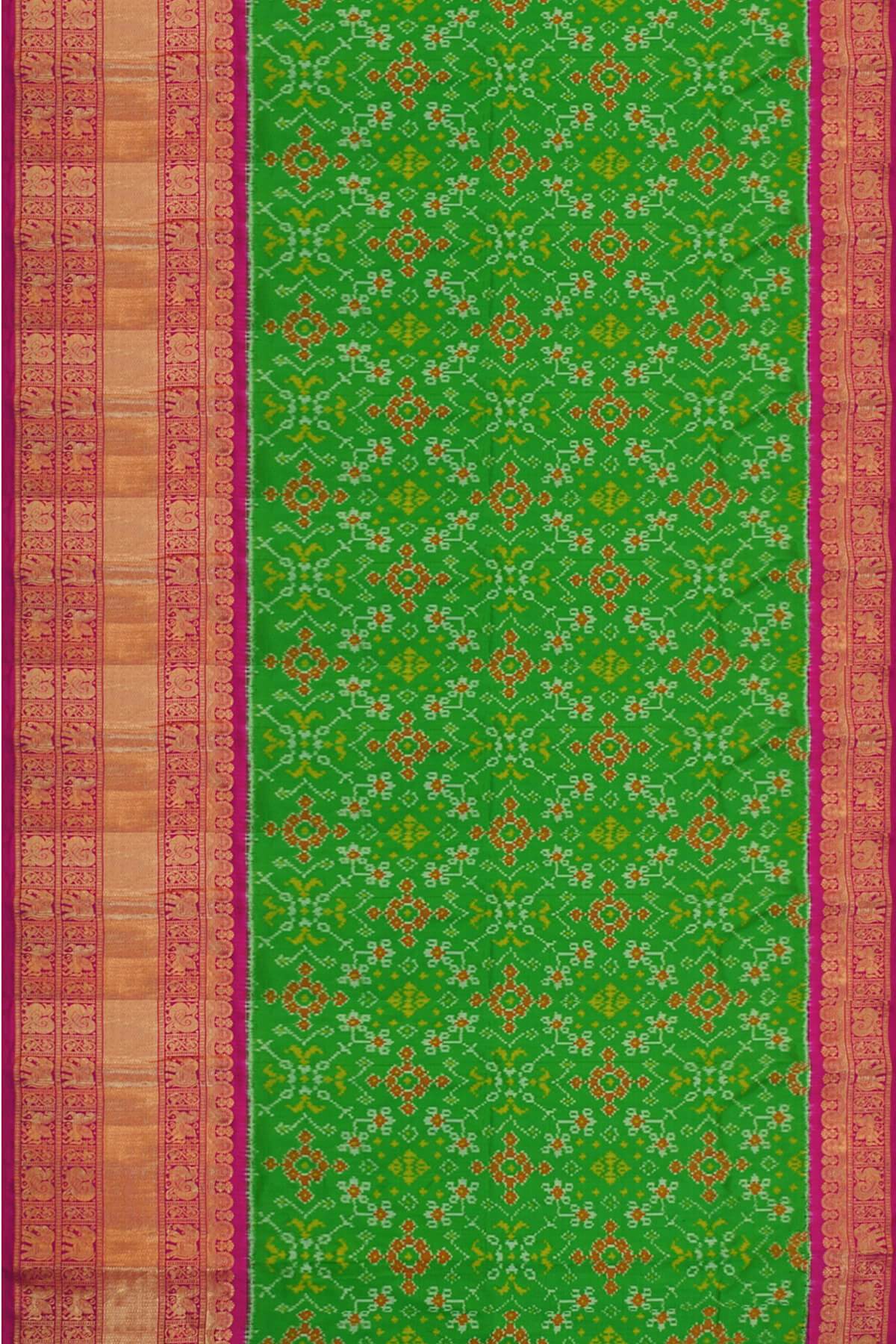 Description: Handwoven Ikat pure silk unstitched lehenga material in green navaratan pattern with pink blouse and a rich kanchi border