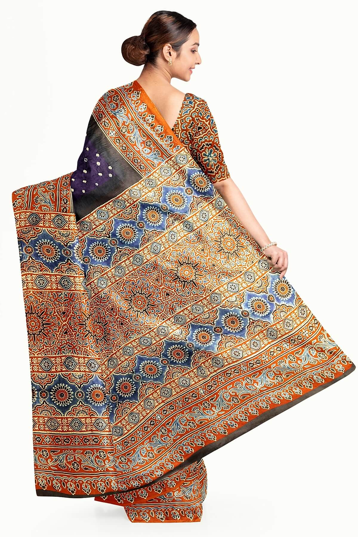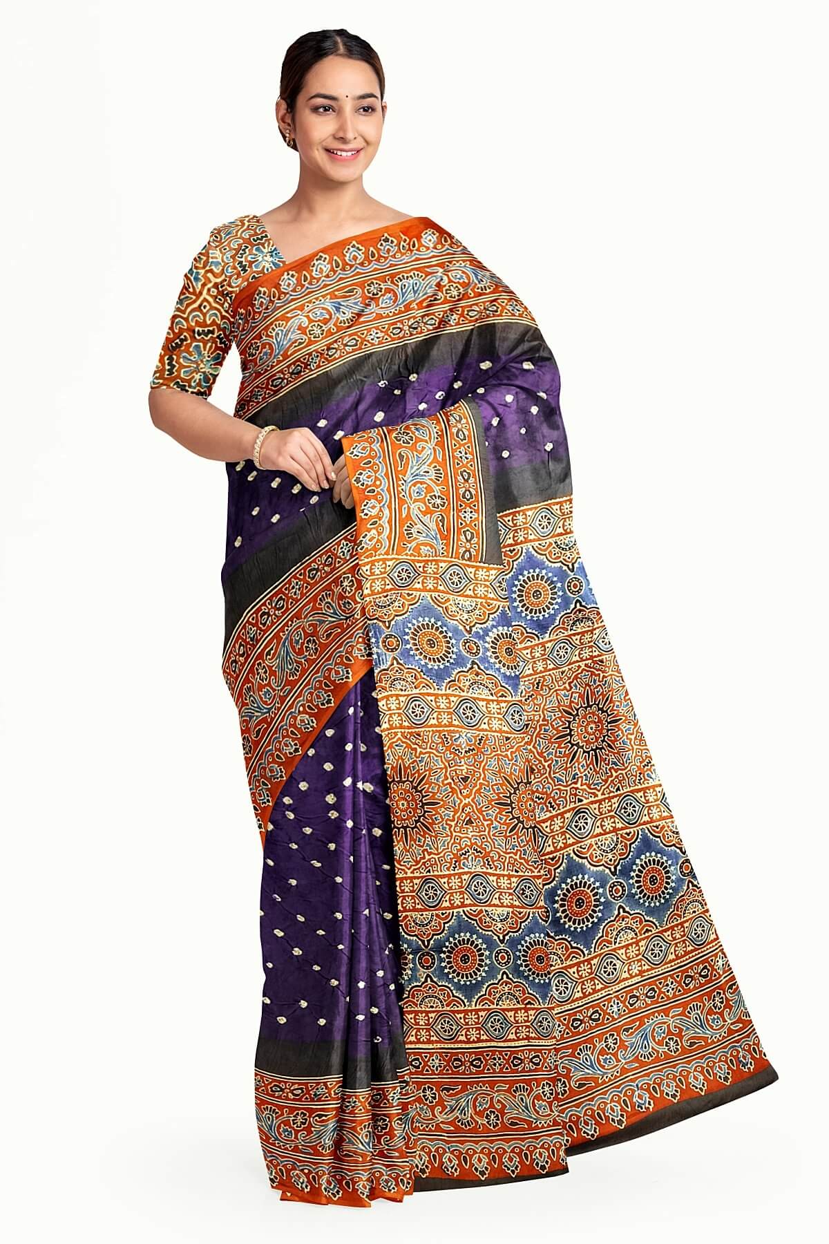 Description :  Modal silk bandhini saree in purple with hand block ajrakh print  in pallu & border